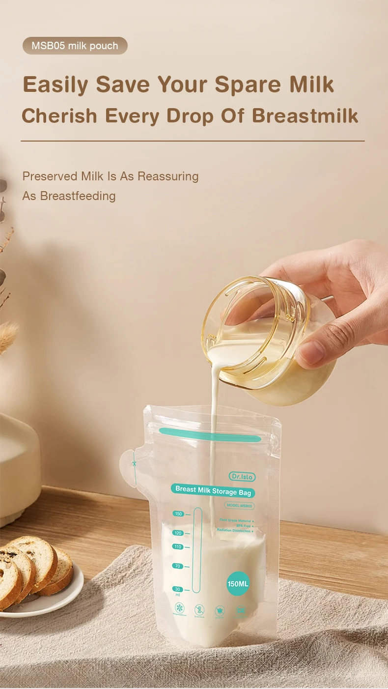 Cada bolsa tiene un medidor para controlar la cantidad de leche, hasta 150 ml.