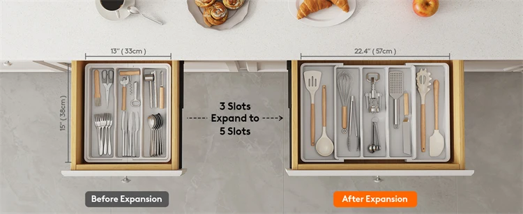 Diseño expandible y ajustable. Se adapta a diferentes tamaños de cajones.